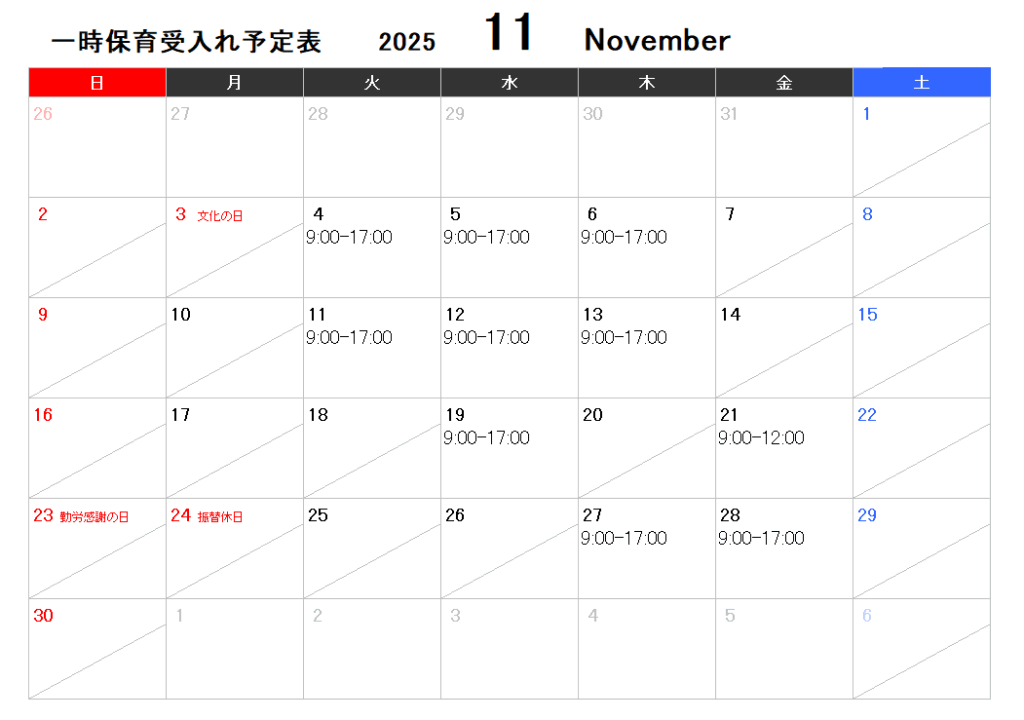 11月の一時保育利用可能日の予定表です。10月より一部利用方法が変更となりましたので、以下の申し込みフォームに記載内容の注意事項をご覧ください。申込Googleフォームhttps://forms.gle/MyKfZyj5YvfjWh4x9