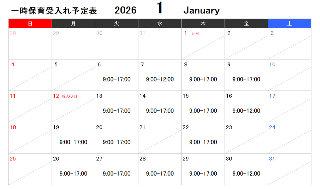 令和8年1月 一時保育受入れ予定表と受付延長のお知らせ その他2025年12月22日